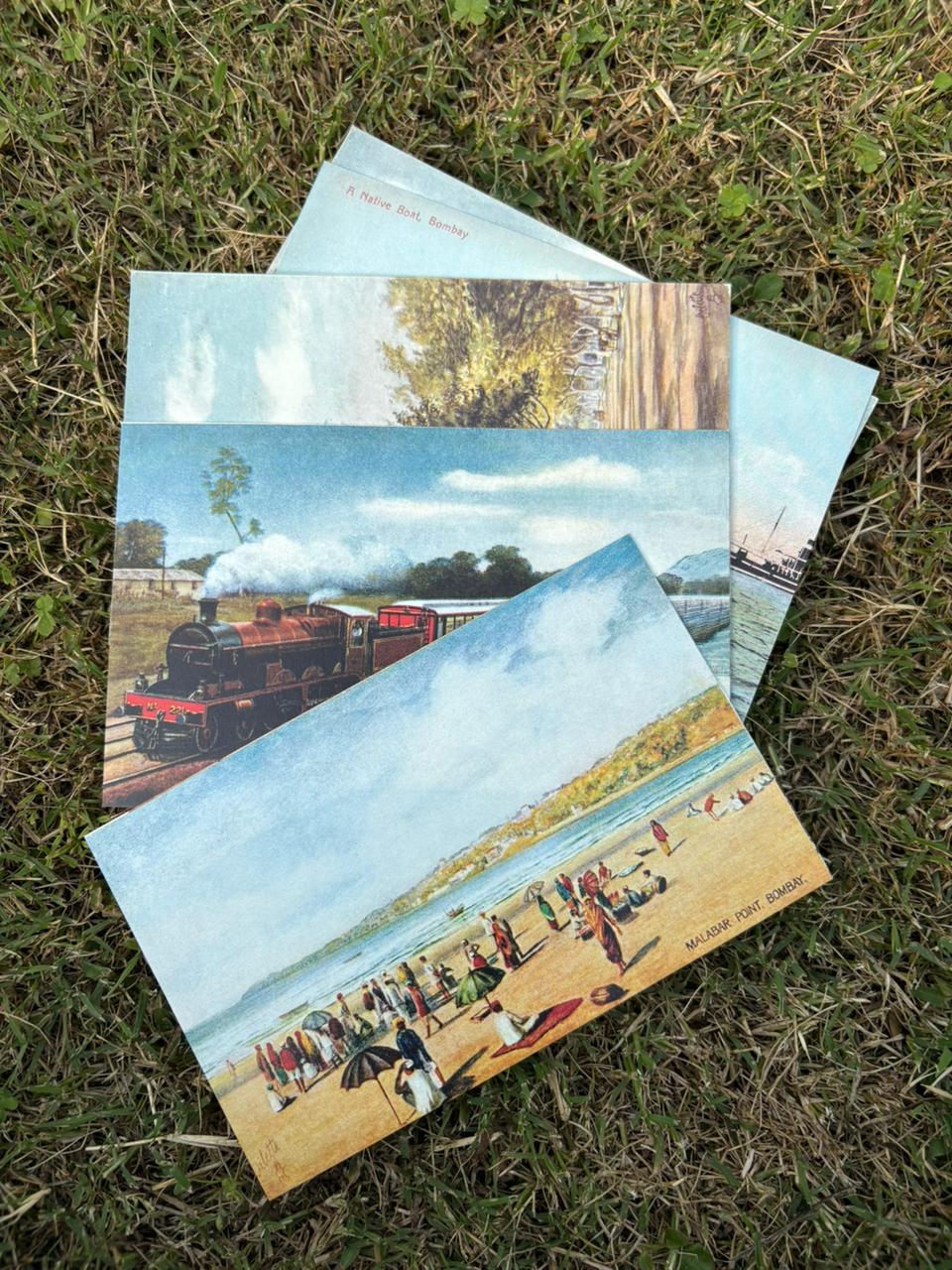 The Daak Postcards set features five beautifully illustrated designs showcasing iconic Bombay scenes, including the Poona Mail and Malabar Point.