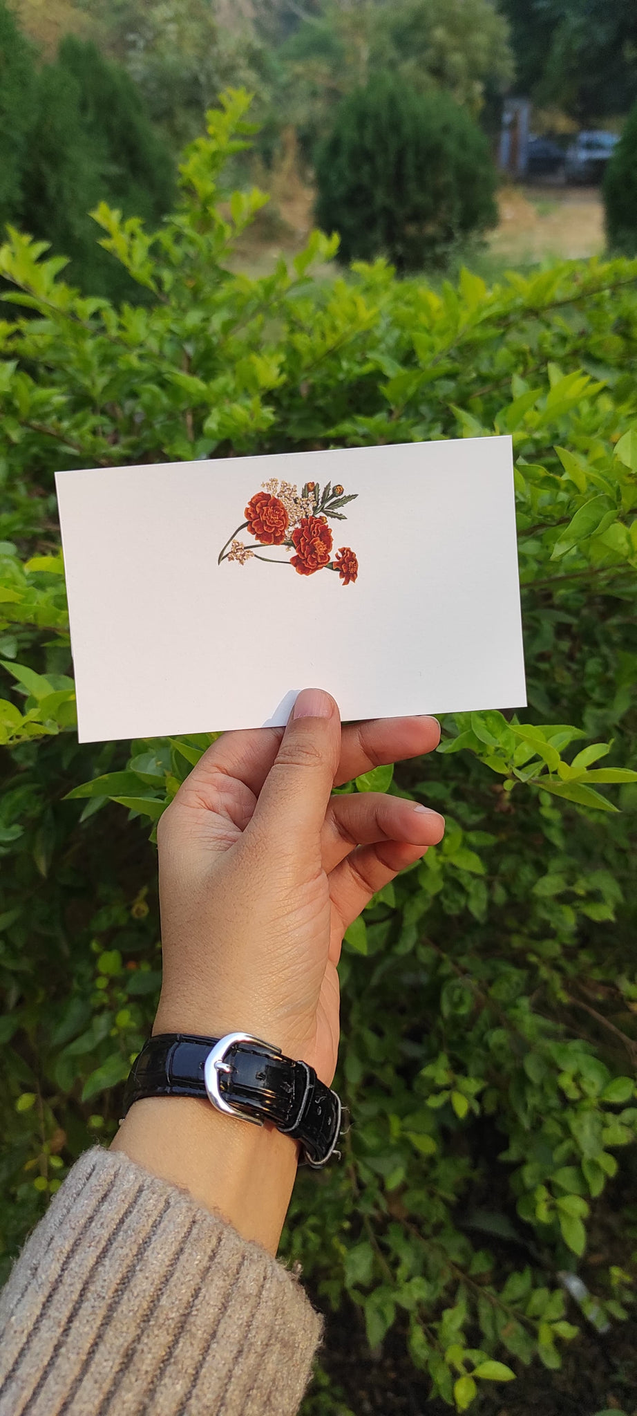 An essential accompaniment for gifts, packages, or special deliveries, this note card features a celebratory marigold. Crafted from premium cardstock, it provides the perfect medium to express gratitude, share warm wishes, or add a personalized message to any occasion.